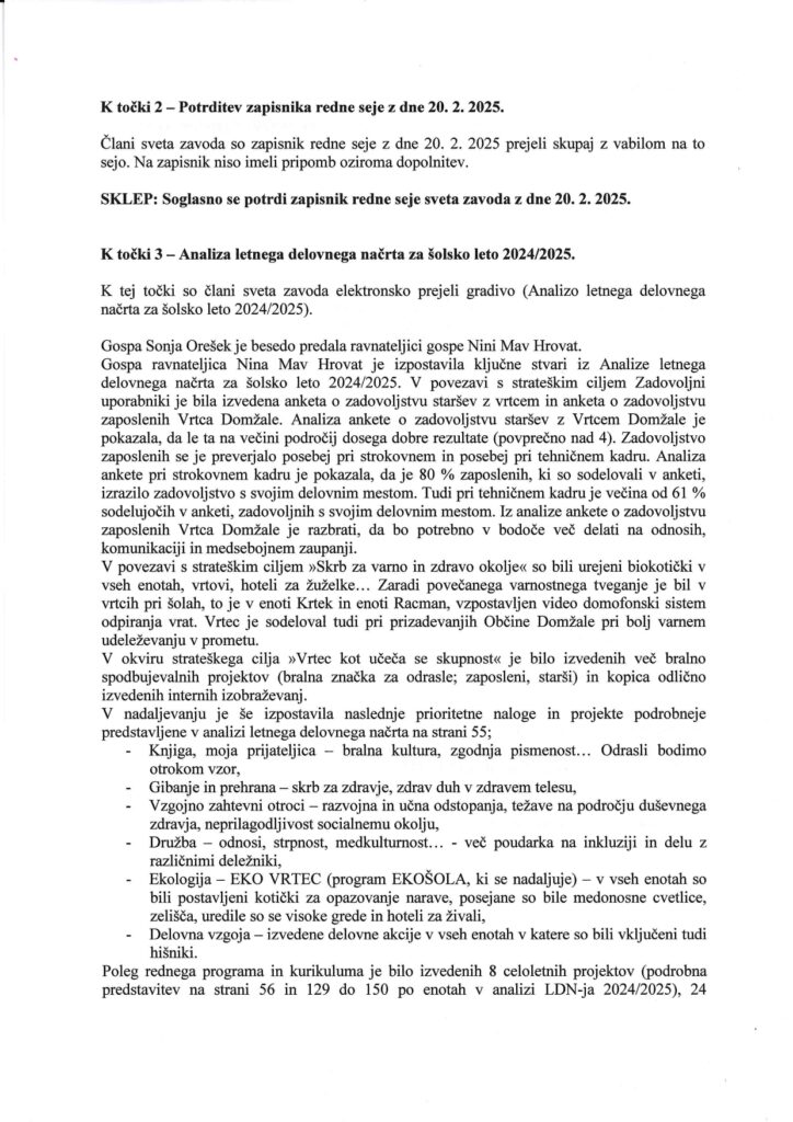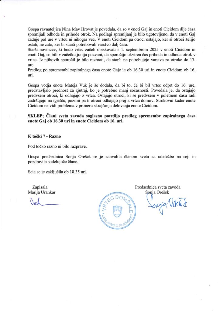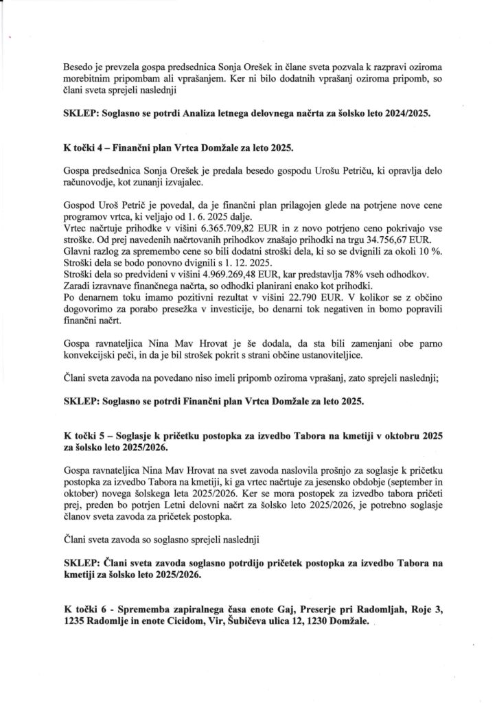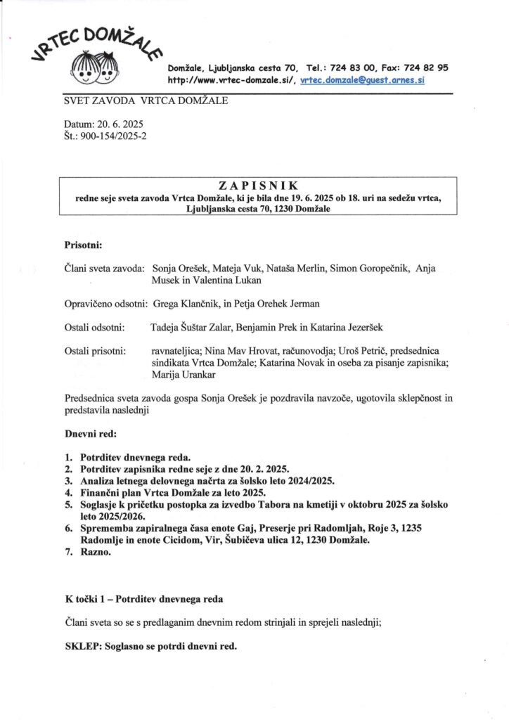 Zapisnik redne seje sveta zavoda Vrtca Domžale z dne 19. 6. 2025